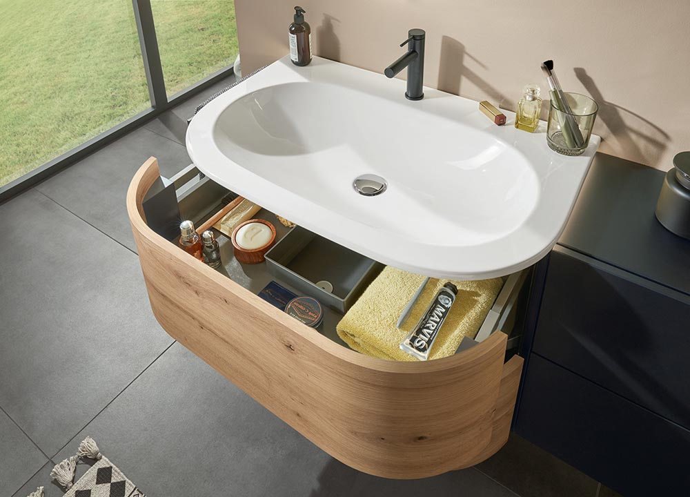 Kernstück der Kollektion ist der Waschplatz, an dem Unterschrank und Waschtisch mit ihren konsequent ovalen Formen eine harmonische Einheit bilden: Die schlichten, wahlweise grifflosen Fronten, unterstreichen das zeitlose und ruhige Erscheinungsbild der Kollektion. Der 80 cm breite Unterschrank bietet mit zwei gleichgroßen, innen in modernem Anthrazit gehaltenen Vollauszügen jede Menge praktischen Stauraum für die täglichen Badutensilien. Dank integriertem Anti-Rutschboden lässt sich alles sicher und ordentlich verstauen.